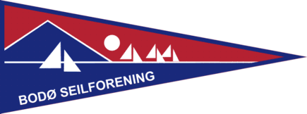 The flag of Bodø Seilforening from Bodø Municipality is horizontally divided dark red over blue, with a blue border and on field a representation of sailboats in front of a mountain.
