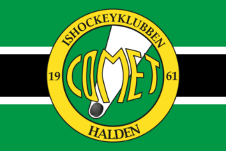 The flags of IK Comet (Ishockeyklubben Comet) from Halden are green with horizontal or diagonal bands in white, black, yellow, and the badge centered.