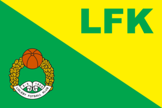 The flag of  (Lisleby Fotballklubb) from Fredrikstad, is diagonally divided yellow over green with the logo in the lower green part and LFK in green in the yellow part.