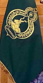 The legislative assembly flag is a green field with the assembly logo centered upon it, in gold.