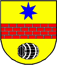 Shield Or a fess Gules masoned Argent, on chief a 7-point star Azure, on base a barrel Sable with hoops Argent.