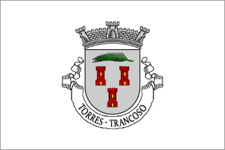 Shield Argent three towers Gules masoned Sable with port and windows Or, in chief a palm frond Vert in fess. Mural crown Argent with three visible towers (village rank) and white scroll reading in black upper case serifed letters "TORRES - TRANCOSO".