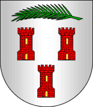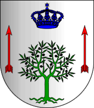 Shield Argent an olive tree eradicated Vert fructed Sable, flanked by two arrows Gules, in chief a Marian crown Azure. Mural crown Argent with three visible towers (village rank) and white scroll reading in black upper case serifed letters "FRECHES".