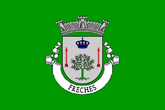Shield Argent an olive tree eradicated Vert fructed Sable, flanked by two arrows Gules, in chief a Marian crown Azure. Mural crown Argent with three visible towers (village rank) and white scroll reading in black upper case serifed letters "UNIÃO DAS FREGUESIAS DE FRECHES E TORRES".