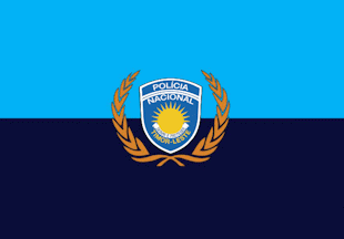 The flag of the National Police (Polícia Nacional de Timor-Leste) is horizontally divided into light blue and darker blue stripes. The badge of Police is placed in the center of the flag flanked by olive branches.