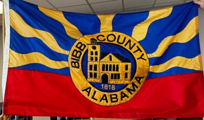 The county flag is made of 14 rays of blue and gold on the upper part, and a red field for the lower area. In the center is an emblem for Bibb County, which shows the Bibb County Courthouse as the centerpiece of the emblem.