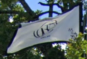 The flag is a white field with a black outline. In the center is the community logo, with the establishment year underneath.