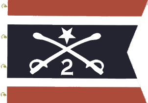 In fact, he also mentions the existence of another flag (again, a guidon) with crossed sabers. That is actually a previous flag: "(a) 34 3/4 x 44 in. merino wool flag, entirely hand-sewn in five lineal panels. The upper and lower panels create red bars, which flank white bars below and above, respectively. The center bar, while blue originally, has faded practically to grey. The star, numeral "2" and crossed sabers are made of merino wool and are double-appliqued (applied to both sides of the flag). These are white in color. The crossed sabers are the traditional emblem of the United States Cavalry. The "2" represents the 2nd Brigade and the single star represents Sheridan's status as a "one star" general. Serving as Philip Henry Sheridan's colors from the Spring - Summer of 1862, the flag was used when he led the 2nd Michigan Cavalry with great effect and rose from Captain to Major General in just six months (not a minor detail since he had no cavalry experience before the war). The fact that the flag is made entirely of merino wool is very unusual. Most Civil war infantry and cavalry flags were made of silk; some were wool bunting, but few are entirely merino wool. This was a common fabric in homemade flags, but is typically seen in the canton and is seldom the only fabric. Commercial flag-makers advertised merino wool flags, but surviving flags made entirely of it are scarce."