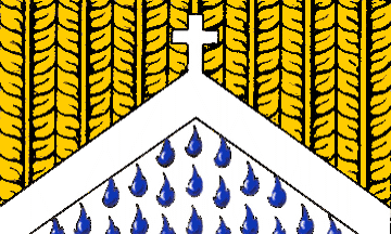 Blazoned, "Per chevron tapissé of wheat Or and Argent semé de flames Azure, a chevron its apex terminating in a cross Argent".