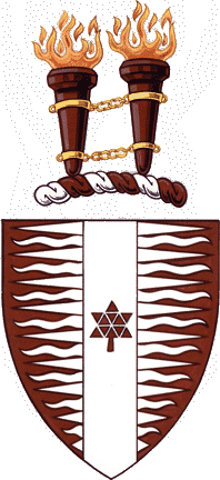 Two torches Murrey enflamed proper banded in chief and in base and joined by two chains the links thereof composed of pairs of letters C Or;