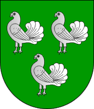 The arms have on a shield Vert three doves Argent.