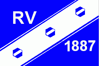 The blue flag was divided by a broad, cotized, white bend sinister. In the upper hoist corner were white initials "RV", in the lower fly corner the year "1887", also in white. The bend was superimposed by three blue hexagons, all divided by a white bend sinister.