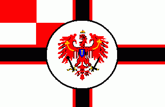 The flag was white parted by a black centred cross fimbriated red. On a centred white disc fimbriated black was the red eagle of Brandenburg with clover stems, sceptre, sword, crown and breast inescutcheon. The upper hoist quarter was quartered of red and white.