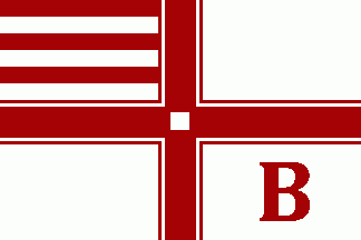 The white flag was parted by a burgundy centred cotized cross. On centre of the cross was a small white rectangle. The upper hoist quarter was horizontally parted by six stripes alternating of burgundy and whitea burgundy-blue-white horizontal tricolour. On lower fly was a burgundy serifed initial "B"