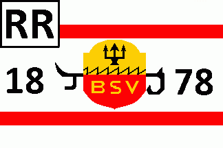 The flag was white with the centred logo of the club, superimposing a black boat hook, all between two red horizontal stripes. The logo was flanked by black numbers "18" (hoist) and "78" (fly). The canton was white separated by thin black lines with black inscription "RR" (= Ruderriege). The logo was parted per fess, above dark yellow with black trident over black waves, below red with dark yellow inscription "BSV.