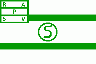 The flag of the rowing department, probably a subdividion of the swimming department, was white. On centre was a green initial "S" in a green circle, all between two green horizontal stripes. The white canton had a green bordure and was parted by two green horizontal lines. It had a green centred inscription as follows: "RA" (top), "P" (middle) and "SV" (bottom).