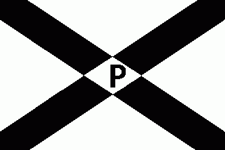 The white flag was parted by a black saltire. On its centre was a white lozenge charged with a black initial "P".