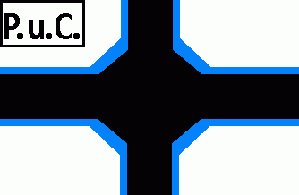 The flag was white parted by a black centred cross, on centre of flag superimposed by a black diamond, all fimbriated blue. On upper hoist quarter in a rectangle with black sides and a black inscription "P.u.C.".