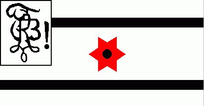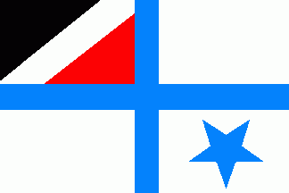 The white flag was parted by a blue cross. The uppermost quarter was parted per bend sinister of black-white-red. On lower fly quarter was a blue 5-point star reversed.