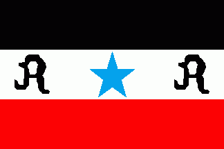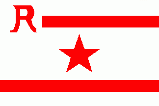 The flag was white with a red 5-point star between two horizontal red stripes. On white canton was a red initial "R".