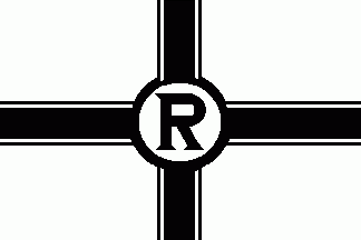It is a white flag, divided by a broad black horizontal line, cotized white and black. In it's centre is a white roundel cotized black with a black "R" and a black disc with a black line upward and a horizontal line embowed at its end.