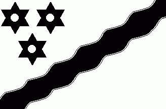 The white flag was parted by a black wavy bend sinister cotized black-white. In canton were three black mullets ordered 2:1.