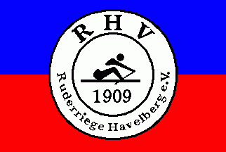 It is a blue-red horizontal bicolour with centred logo, a white disc, displaying a rower above from "1909", surrounded by a thin black circle, outside "RHV"(above) and "Ruderriege Havelberg e.V."(below).