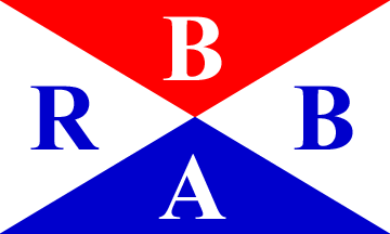Quartered per saltire, top triangle red, bottom blue, hoist and fly white. On each triangle, one of the companies initials (BRBA), in white on the top and bottom triangles and black (see left image above) or blue (see right image above) on the white ones.