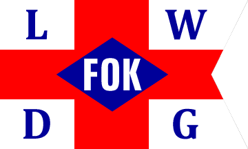 The company was based in Lübeck, had in 1933 three freighters and offered a line service to Finland: Lübeck-Wyborg(!)-Kotka. The first version of the flag (see left image above) was white, divided by a broad, red, centred cross. In the corners are blue, serifed capitals "L" (upper hoist), "W" (upper fly), "D" (lower hoist) and "G" (lower fly). In the centre of the flag is a blue lozenge containing white capitals "FOK". The other version of the flag (see central image above) was white, parted by a red centred cross, with yellow letters, fimbriated black, in the quarters "W" (upper hoist), "L" (upper fly), "G" (lower hoist) and "D" (lower fly). The centre of the cross is superimposed by a white lozenge with yellow inscription, fimbriated black "F.O.K.", probably referring to the owner.
