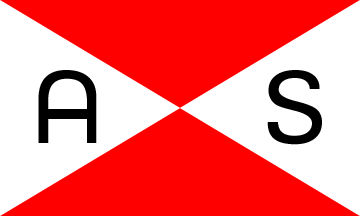 Source shows a flag divided saltirewise red over white flag with black intials "A" and "S" set in serifless capitals, one on each white triangle; the letterform of "A" shaped like an inverted, barred "U".
