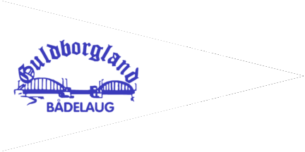 The pennant is white with a blue bridge flanked on top by an embowed blue Gothic inscription "Guldborgland"" and on bottom by blue initials "BÅDELAUG".
