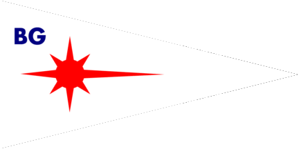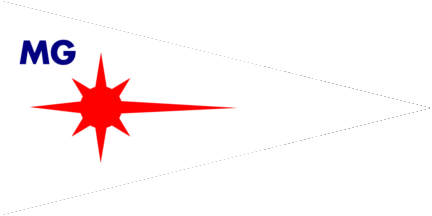 The club is based in Nykøbing / Falster. The pennant is white with a red disc with eight spikes, those pointing to hoist and fly are longer. In canton is a blue inscription "MG" (see left image above) or "BG" (see right image above). The name giving sound divides Falster from Lolland.