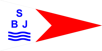 The pennant is white parted by a blue horizontal line, in upper hoist are blue initials "SB", in lower hoist two blue waves in pale.