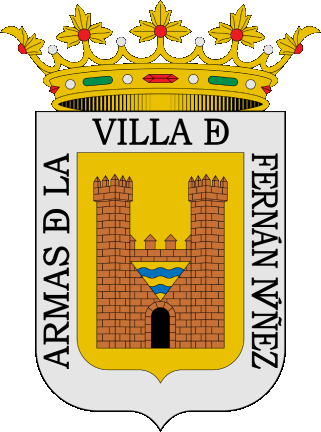 Description: Gold shield, a two-towered castle, charged with a gold [ triangular ] escutcheon and azure waves. The crest is an open royal crown. It also includes a white border with the inscription "Arms of the town of Fernan-Núñez"