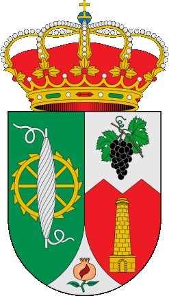 Description: "Shield divided: 1st, vert, a gold waterwheel and superimposed a ball of silver silk thread wound on a spindle; 2nd, divided per fess dancetty: a) argent, a bunch of black grapes with their leaves proper; b) gules, a gold mine chimney; in base argent, a pomegranate with leaves proper. It is surmounted by the royal crown of Spain."