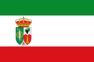 Description: "Rectangular flag with proportions 2:3 formed by three horizontal stripes in proportion 1/4, 1/2 and 1/4, the upper one being green, the middle one white and the lower one red, bearing the municipal coat of arms on the white stripe at 1/4 of the hoist."