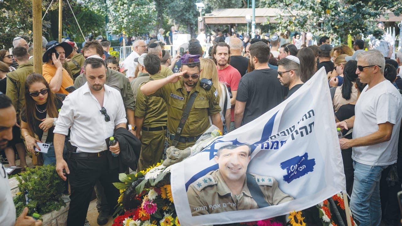 Picture caption reads: "Family and friends of Col. Asaf Hamami during his funeral in Tel Aviv, on Tuesday [4 Nov. 2025], behind a flag bearing his likeness. (photo credit: Chaim Goldberg/Flash90)".