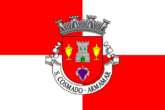 Shield Gules an enhanced tower Argent masoned Sable with port and windows Vert, flanked by two chemists´ jars Or, on base on a grape leaf Argent a grape bunch Purple. Mural crown Argent with four visible towers (town rank) and white scroll reading in black upper case serifed letters "S. COSMADO - ARMAMAR"