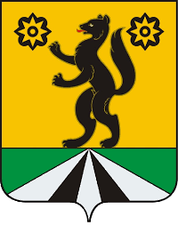 In a gold field - a black sable, rising on a green tip, burdened with an inscribed pyramid, divided into five wedges converging at the top: between three silver - two black; all accompanied in the upper corners by two black stones (with four sharp and four rounded angles), each of which is burdened with a pierced star in the color of the field and with a bezant of the same metal in the hole.