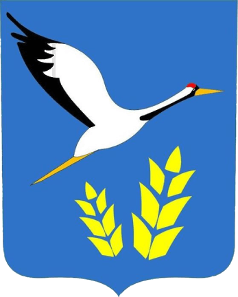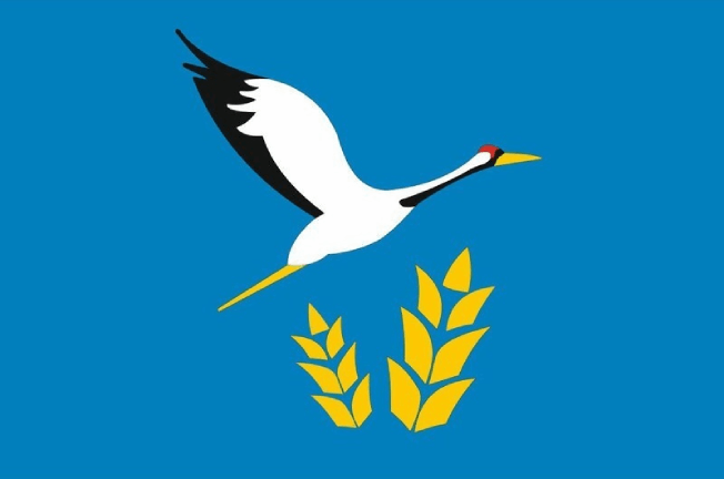 On an azure (blue, light blue) field, a silver crane flying to the left with a black breast and wingtips, a scarlet (red) back of the head, a golden beak, eyes and legs, accompanied below by two golden heads of grain ears (the left one is larger), laid out in a fan shape.