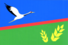 A rectangular cloth with a width-to-length ratio of 2:3, blue at the top and green at the bottom, divided by a red stripe running from left to right upwards. In the upper left corner of the cloth is a crane taking flight, and in the lower right are ears of wheat.