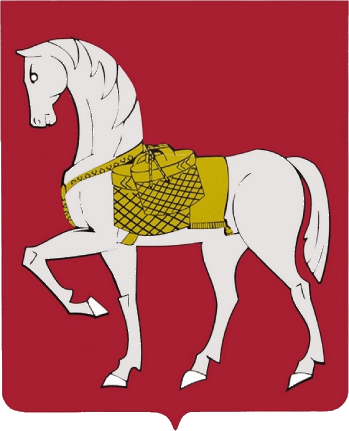 On a gules (red) field, a walking silver horse with a gold saddle, girth, and saddle cloth, carrying two gold round wicker boxes with lids, one of which is larger.