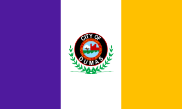 The flag is a vertical tribar of Purple-White-Gold, which pertains to the official colors used by Dumas High School, which are purple and old gold. In the center is the Dumas city seal, which is wreathed by olive branches. The seal is made of a twos rings, a black one with the city name, and a red one which clockwise says "Agriculture, Industry, Recreation." The central disc shows the three elements representative of the motto, A cotton boll for agriculture, a brick factory for industry, and a river for recreation.