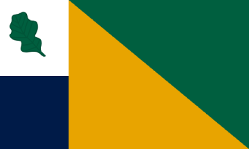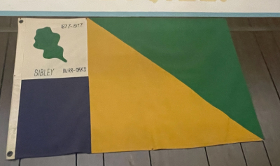 The Sibley flag designer chose colors to represent Sibley Lake (blue), the grain (gold), and the Burr Oak trees (green). A Burr Oak tree leaf is featured in the upper left-hand corner.