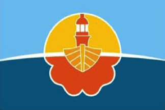 The upper part of the flag represents the sky, while it lower part represents the sea.The emblem includes a yellow boat, symbolizing fishing, surmounted by the cupola of the Recalada Light*. The boat and the lighthouse are surrounded, at the top, by a yellow half disk representing sundown at sea, and, at the bottom, by flower's petals symbolizing the Spring National Festival, emblematic of local tourism.