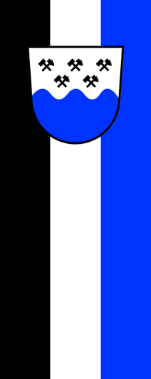 | Description of arms (German): | Im Wellenschnitt geteilter Schild, oben in Silber fünf 3:2 gestellte schwarze Bergbauzeichen (Schlegel und Eisen), unten blau. [1] [2] |