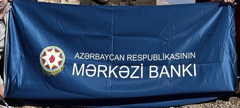 The flag of the Central Bank of Azerbaijan, with image obtained from https://www.facebook.com/photo.php, is dark blue with the logo centered.