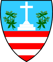 The coat of arms (municipal website) is in a 14th century gothic shield shape, "Per fess azure a calvary cross argent between two branches of madder vert and gules two bars argent".