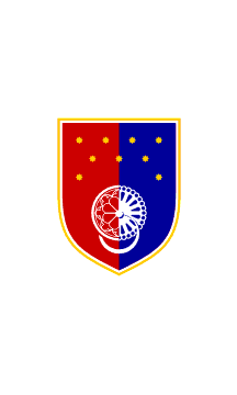 The flag (photo) is prescribed in proportions 3:5 (horizontal) or 5:3 (vertical), white with the coat of arms, bordered yellow, in the middle.