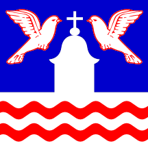 The flag is a variation of the banner of arms: "Azure between two doves argent regardant volant a monastery dome argent issuant from a base also argent with two barrulets wavy gules".